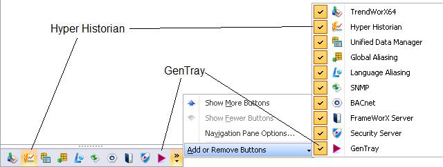 Click Start > All Programs > ICONICS > Workbench. In the Workbench either click the Hyper Historian icon in the button bar or select the program from the Add/Remove Buttons menu at the bottom of the navigation tree.