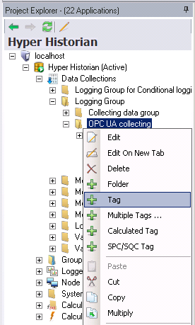 - Right-click on the OPC UA collecting group and select the Tag option.