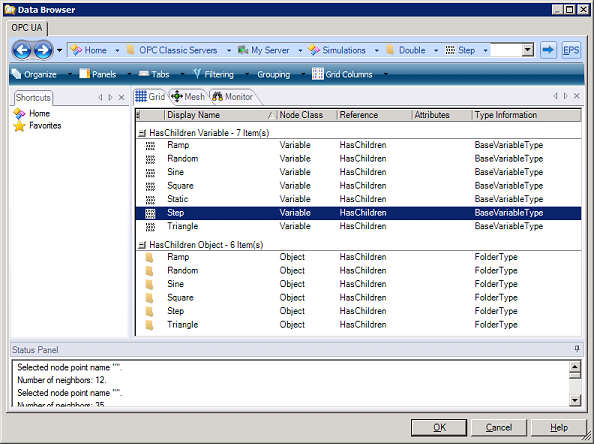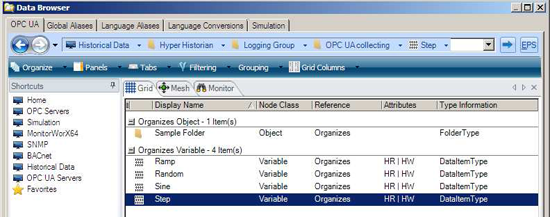 - Double-click the Logging Group, the Data Collector Group (OPC UA collecting), and the folders as they appear, until you see the Hyper Historian tags you have configured.