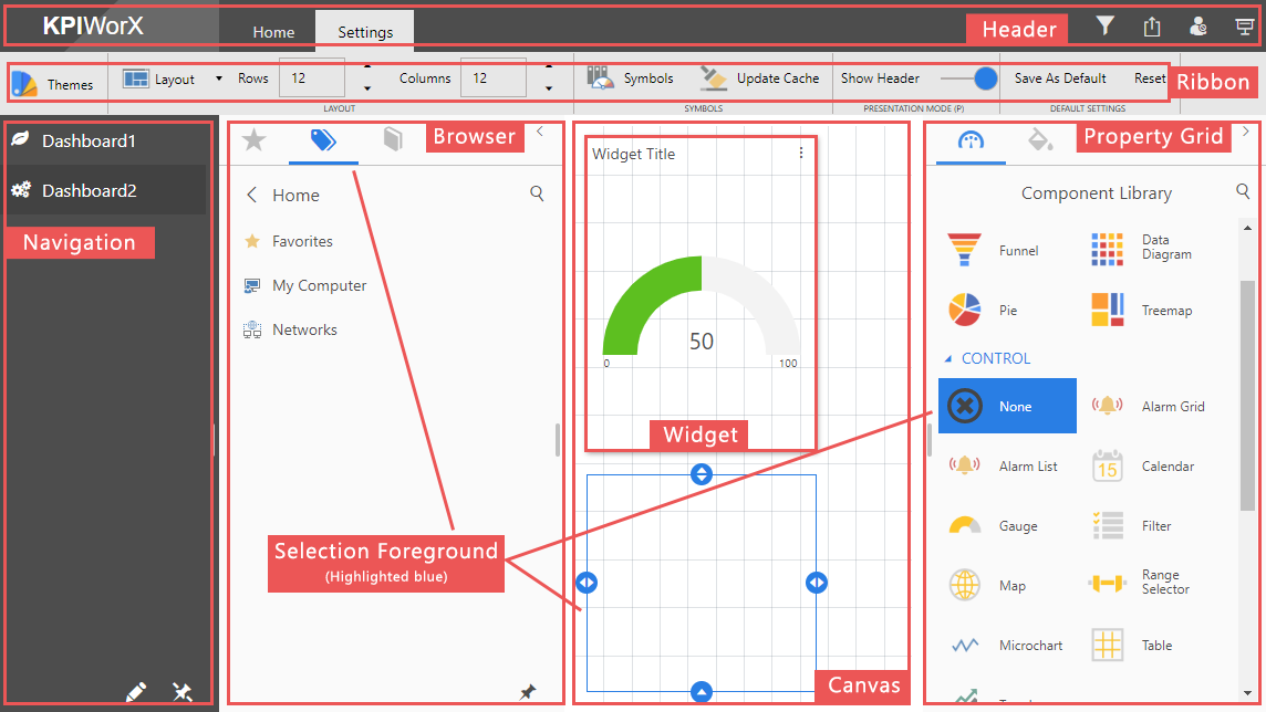 Themes allow the user to customize the colors of various KPIWorX elements, including: