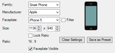 Faceplate - Faceplate model to be used in the new mobile display. Use the pulldown menu to select from Adjustable, Galaxy S4, Galaxy S6, iPhone 4S, iPhone 5, iPhone 6, iPhone 6 Plus, Lumia 920, Lumia 930, Nexus 5, Nexus 6, Moto X, HTC One, Galaxy Tab 10.1, iPad, iPad Mini, Surface RT, Surface 2, Surface 3, Surface Pro, Surface Pro 2, Surface Pro 3, or Kindle Fire HD 8.9.