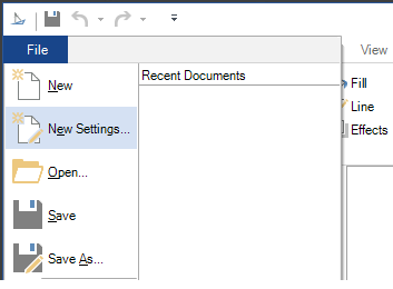 In GraphWorX64, click the "File" tab on the top right above the Ribbon. Then, go down and click on "New Settings." This will bring up the dialog box to create a new display.