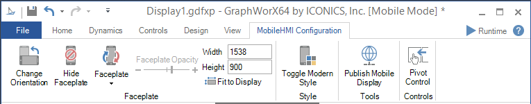 Select File> New> Windows Mobile from the GraphWorX64 Viewer menu to create a new Mobile Display. You'll notice that the Ribbon now has a new tab that contains all of your MobileHMI configuration and display features.