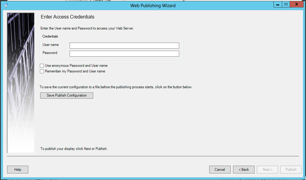 Click Next to proceed to the Enter Access Credentials section of the Web Publishing Wizard. Enter the information requested to access your Web Server. You will also have the option to Save Publish Configuration to a file before proceeding to web publishing.