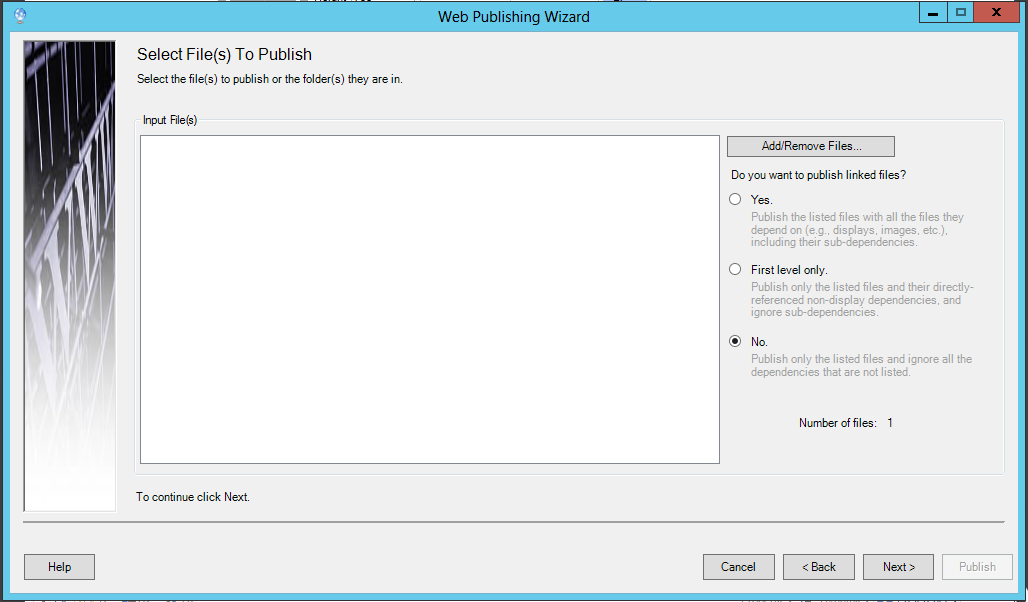 The Select File(s) to Publish screen appears. Use the Add/Remove Files button to add files to the Input File(s) section of the window. You also have the option as to whether and how to publish linked files.