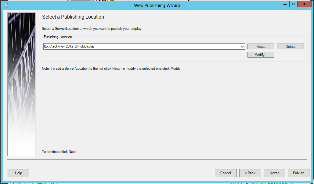 Click Next to proceed to the Select a Publishing Location section of the Web Publishing Wizard. Enter the information requested to access your Web Server.