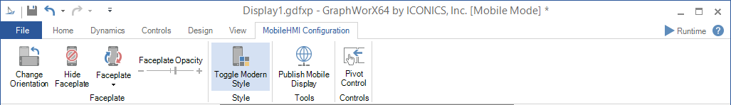 The 'Toggle Modern Style' button in the MobileHMI Configuration ribbon lets you switch between phone styles.