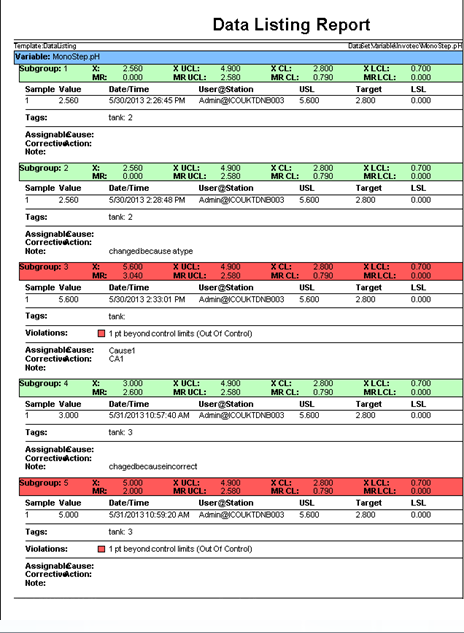 These reports list several values related to SPC calculations, including: X, MR, CL, USL, LSL, and target. They mark any values that violate associated SPC distribution rule sets by highlighting them in red. The reports even provide a set of corrective actions and assignable causes to help you rectify any performance issues within your system. You can view these reports in ReportWorX or ReportWorX Express.