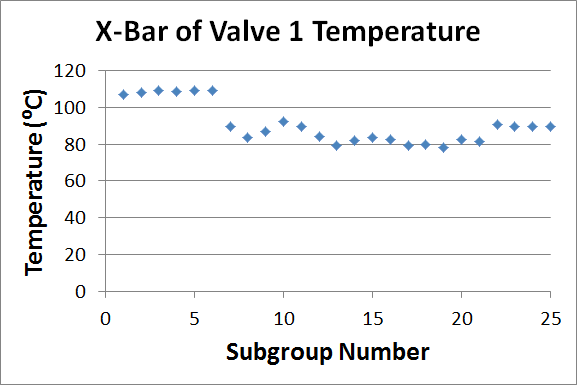 Some subgroup values appear in the chart below. Note that these values represent 5-value averages of the samples that appear in the Samples section of this topic (and are therefore x-bar summaries of the original sample values).