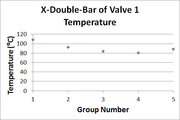 Some group values appear in the chart below. Note that these values represent 5-value averages of the subgroups that appear in the Subgroups section of this topic (and are therefore double-x-bar summaries of the original sample values).