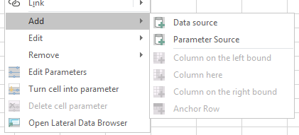 Data sources can also be added via the context menu. Bring up the context menu of a cell to see the ReportWorX64 options available. These options include the same Add, Edit, and Remove menus found in the ReportWorX64 ribbon, along with the ability to work with parameters and open the data browser.