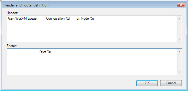 To view the header configuration, click the Header and Footer button on the Printer Logging tab of the AlarmWorX32 Logger Configurator.