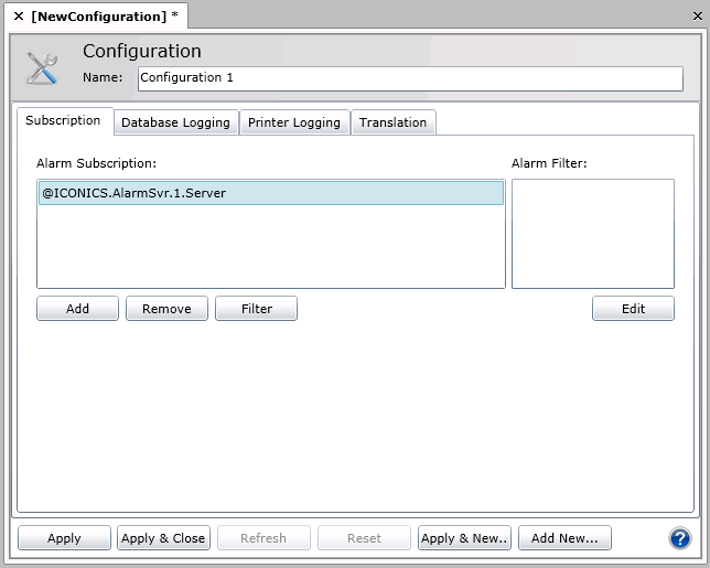 In AlarmWorX64 Logger, the Configurations node manages the overall details of the logging session. You set the data source that supplies alarm events in the Alarm Subscription section of the form. Alarm events are generated by different types of alarm servers, as well as by the GenEvent server. Unless you set a filter, all of the alarms appear in the log. Use the filter to control the data set, choose particular classes and categories of alarms, and make the data set smaller, more selective, and more manageable.