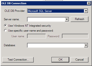 Enter the OLE DB Provider, Server Name, security model and credentials; then select the Database from the fields in the OLE DB Connection dialog box. The Server Name and Database drop-down menus are populated automatically. It is recommended that you use Windows NT Integrated security, which eliminates the need for maintaining individual user accounts and passwords.