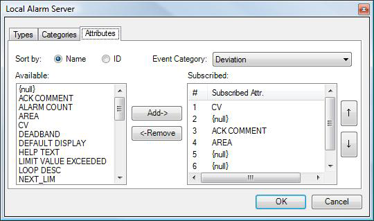 to filter categories and attributes for individual event points that are logged. Clicking this button opens the Local Alarm Server dialog box, which has three tabs: the Types tab, the Categories tab, and the Attributes tab. For help using these tabs to set up a filter, refer to the Limiting Alarm Subscriptions by Event Type and Category topic.