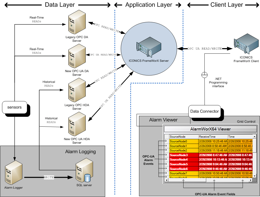 AlarmWorX64 Server is an ICONICS server application that communicates with OPC UA, OPC-AE, and OPC-HDA real-time and historical data sources. The AlarmWorX64 Server receives field data from any OPC-compliant Data Access server and performs alarm detection and reporting based on the OPC Alarm and Events Standard.