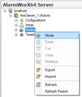 Right-click Nodes in the tree of the AlarmWorX64 Server configuration, then select the Node from the menu. The AlarmWorX64 Node form for the new node appears.