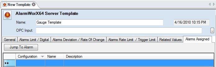 The steps for defining a template are the same as for defining an individual alarm tag. The form for creating a template is nearly identical to the form for creating an alarm tag. One major difference is that the template form has one additional tab, the Alarms Assigned tab, where you can see the alarm tags that reference the template.