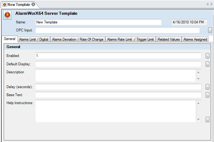 In the Project Explorer, right-click the template in the AlarmWorX64 Server navigation tree, then select Edit or Edit on New Tab. The AlarmWorX64 Server Template form appears.