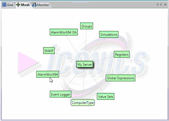 Since OPC UA doesn't store alarms in a tree type hierarchy in the Data Browser, you may find it more convenient to browse for alarms using the Mesh view of the Data Browser; if you subscribe to a particular alarm you will see any of the other alarms or sub-areas that are beneath that alarm or area in the alarm hierarchy.