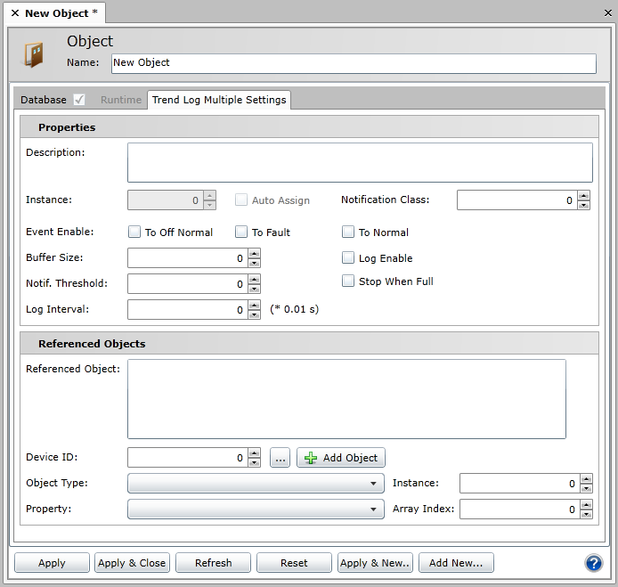 - Fill in all the properties you need to configure and press the Apply button to create a Trend Log Multiple object in the device (if the device supports it).