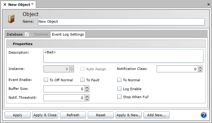 - Fill in all the properties you need to configure and press the Apply button to create an Event Log object in the device (if the device supports it).