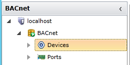 Once you have loaded the BACnet provider in the Workbench and added a New Database (or Attached or Connected to one), you'll notice the BACnet branch in the Project Explorer navigation tree. In addition to editing general BACnet settings, you can also add a new Device or Port. You can also Export or Import related BACnet-related files (in XML format). For additional information, refer to the Fast Browsing BACnet Devices topic.