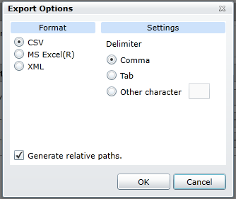 The Export Options dialog box appears, at which point you can decide in which format you would like the data to be exported (CSV, Microsoft Excel or XML), as well as set the Delimiter.