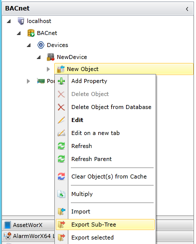 Right-click on the item from which you wish to export. This can be from the database, network, Device, Port or Object level of the BACnet Connector Project Explorer. Select Export Sub-Tree or Export selected from the pulldown menu.