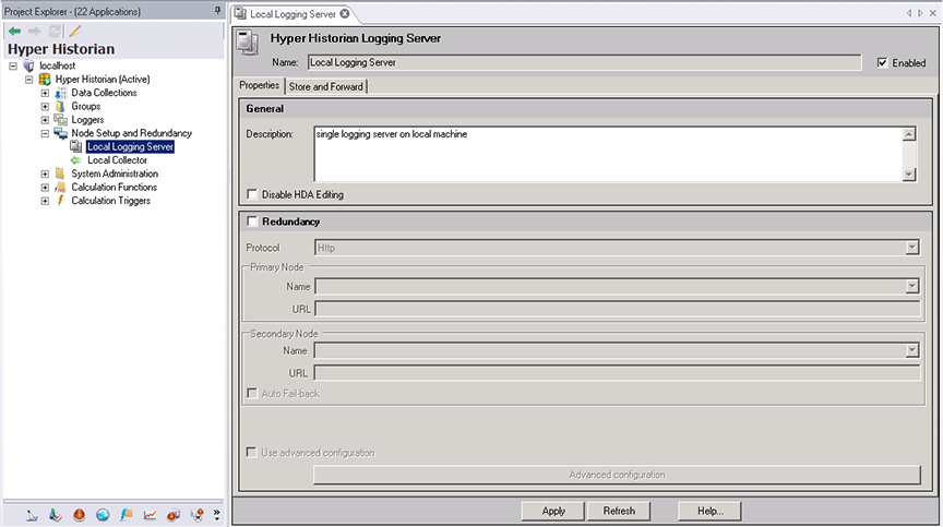 The Hyper Historian installation initializes the Node Setup and Redundancy configuration. Its default settings are for a non-redundant single workstation setup (that is, a non-redundant Hyper Historian Logger with one local Collector).
