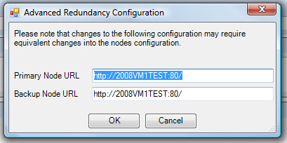 Click the check box next to Use advanced configuration to allow further configuration. Once the box is checked, click the Advanced Configuration button at the bottom of the window. This opens the Advanced Redundancy Configuration dialog box, which allows you to enter both the Primary Node URL and Back Node URL directly (rather than from the selection of the Primary/Backup Nodes in the main properties window). Note that changes to this configuration may require equivalent changes in the nodes configuration. Click OK to close the dialog box and proceed.
