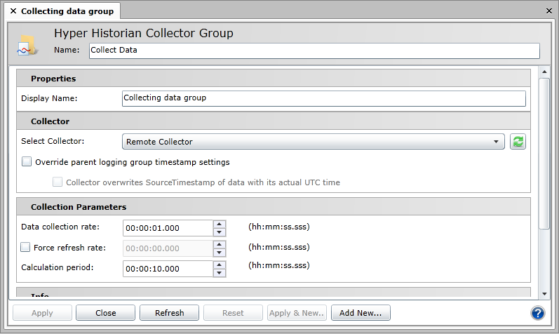 Now that you have a collector group configured (within the Loggers & Groups tree node) to use the remote collector, you can the select the same collector group within the Data Collections tree node to add tags to it like you would for any other collector group. See the topic about Hyper Historian Tags for more details.