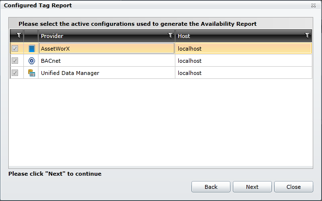 The configurations listed may differ, depending on the template you selected in Step 3. Click on the checkbox(es) to the left of the active configurations you wish to be used to generate the Configured Tag Report. Once you have completed this step, click on the Next button.