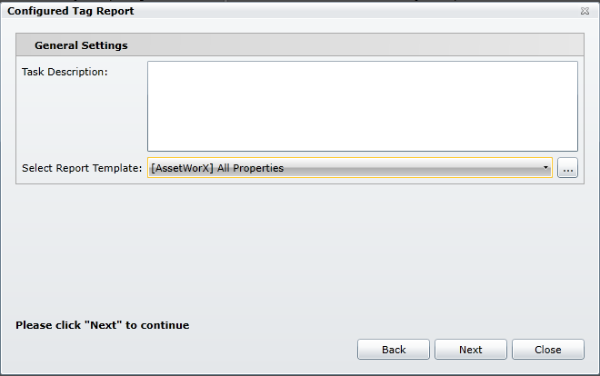This opens the General Settings section of the Configured Tag Report Wizard, as shown below.