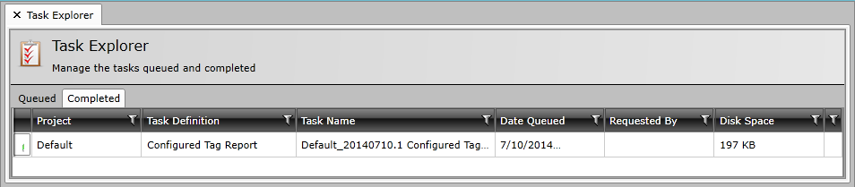 Click Task Explorer to see the status and additional information regarding the selected Configured Tag Report task, as shown below. Your task may be listed in either the Queued tab (if still running) or Completed tab.