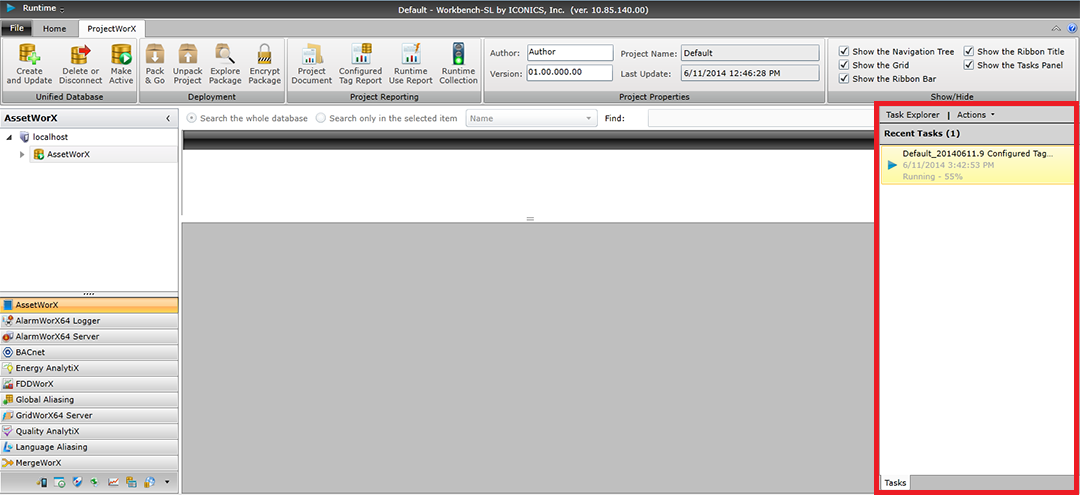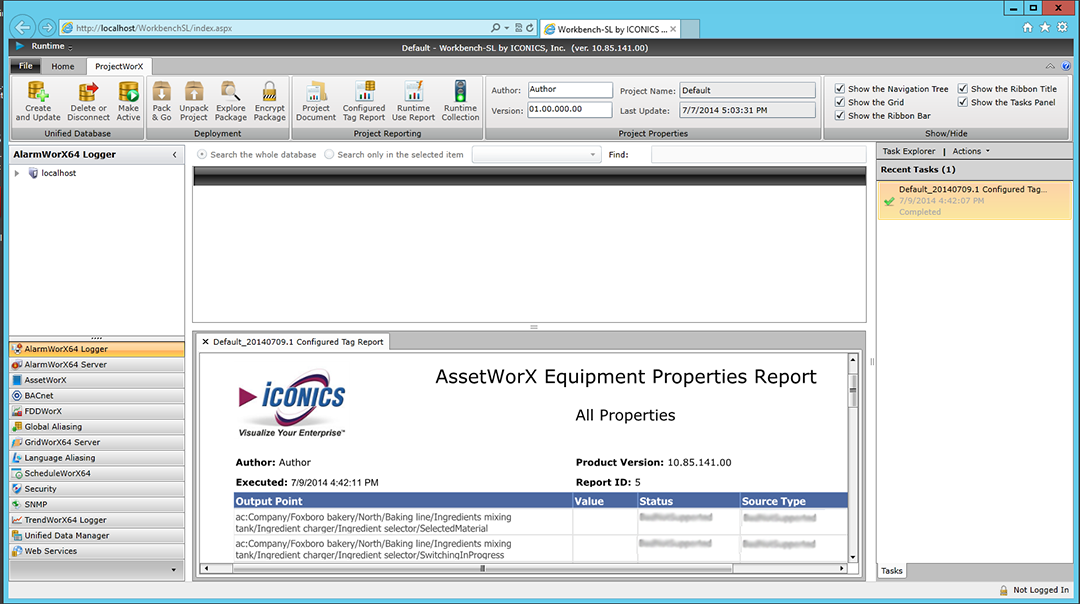 The Configured Tag Report Wizard then proceeds to create your requested report. Reports are generated asynchronously on the server. You will see the report's status appear in the Task Panel on the right side of the Workbench, as highlighted below.