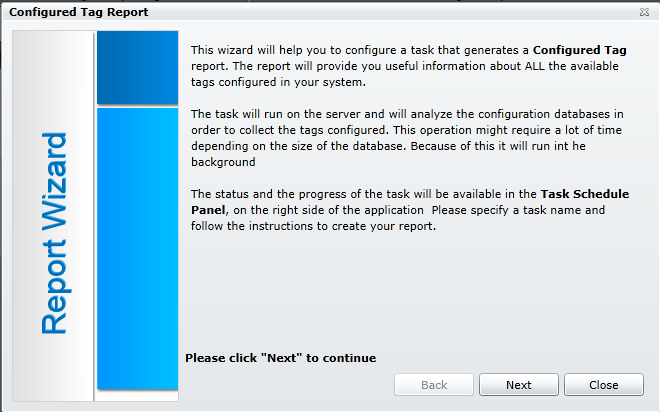This opens the first screen of the Configured Tag Report Wizard window, as shown below. Upon first use, you can read through the description of the wizard. Click Next to continue.