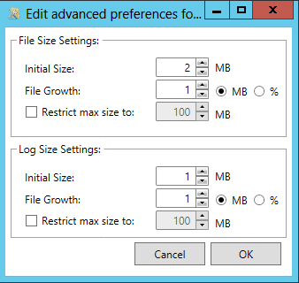 File Growth - Use the text entry field or the up/down arrows to enter the file growth size for the unified database (in MB or percentage of file size).