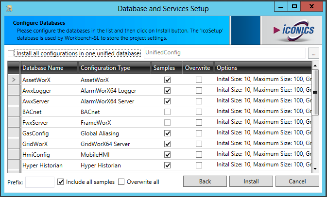 The Database Name column will disappear, no longer showing the multiple individual databases that were to be created for each separate the Workbench provider. It will now be assumed that you intend to proceed with the one unified database for use in each provider (or 'Configuration Type' as described in the Database and Services Setup window). You will have the same options to include Samples (which will appear differently within each provider, contextually) or to Overwrite any existing database. This can be done individually for each provider (Configuration Type) or you can elect to Include all samples and/or Overwrite all.