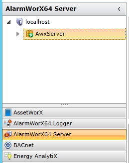 If you had not created a unified database during product installation (or via the Configure System tool), when you first launch the Workbench (unless you previously changed any database settings such as names, etc.), the default connected databases would be specific to each provider. For example, in the following image, you see that the 'AwxServer' database (within the server 'localhost') is being used within the AlarmWorX64 Server provider.
