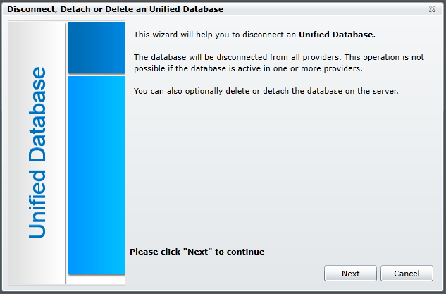 This opens the first screen of the Unified Database Wizard in Disconnect/Detach/Delete mode. Read the instructions, then click Next to continue.