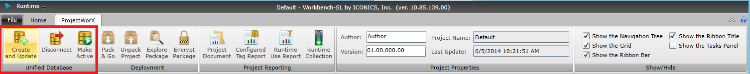 Click on the Create and Update button in the Unified Database section of the ProjectWorX Ribbon in the Workbench, as shown below.