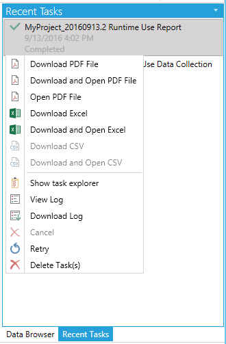 You can right-click on the completed Runtime Use Report task in the Recent Tasks Panel for additional options, including Download PDF File, Download and Open PDF File, Open PDF File, Download Excel, Download and Open Excel, Download CSV, Download and Open CSV, Show task explorer, View Log, Download Log, Cancel, Retry, and Delete Task(s). [Note: The same right-click options are available when viewing the task within the Task Explorer.]