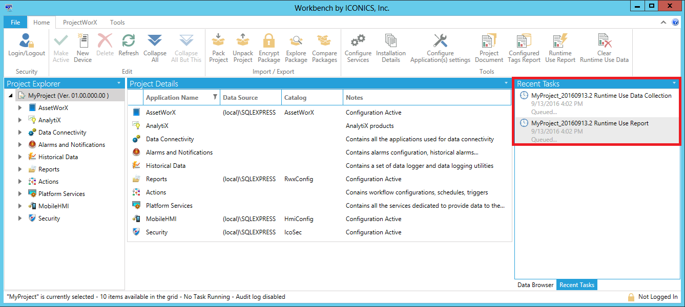 The Runtime Use Report Wizard then proceeds to create your requested report. Reports are generated asynchronously on the server. You will see the report's status appear in the Recent Tasks panel on the right side of the Workbench, as highlighted below.