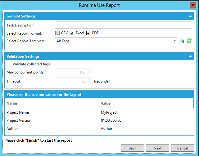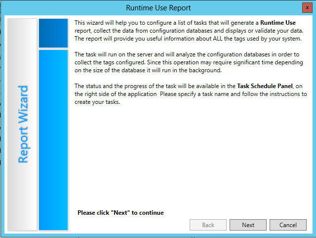 The Runtime Use Report is more complex than the Configured Tags Report. Three independent tasks are created (Creating Report, Tag Collection, Validation). All the tasks are optional, but at least one task must be selected. It’s also possible to create each task without the wizard, using the menu in the task panel.