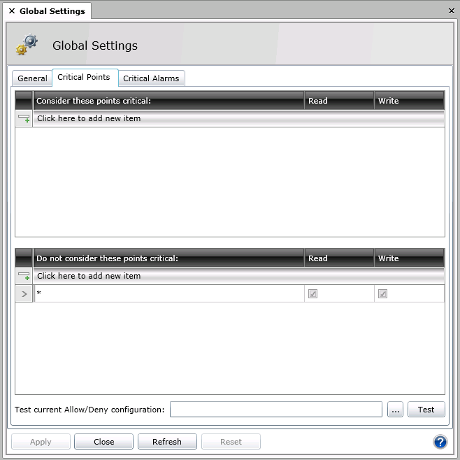 On the Critical Points tab of Global Settings, shown in the figure below, you can designate a subset of write-able points (OPC data items) known as critical points. When writing a new value to a critical point, the user will be prompted to login again immediately before writing a new value. This ensures that the person writing the value is an authenticated user.