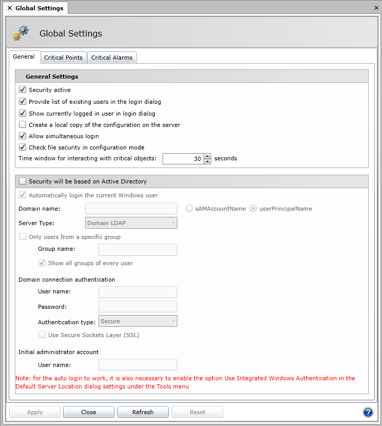 Use Global Settings to set polices that control how the GENESIS64 Security Server maintains accounts in its database. You can also identify critical points and alarms in your database that cannot be written to without user authorization.