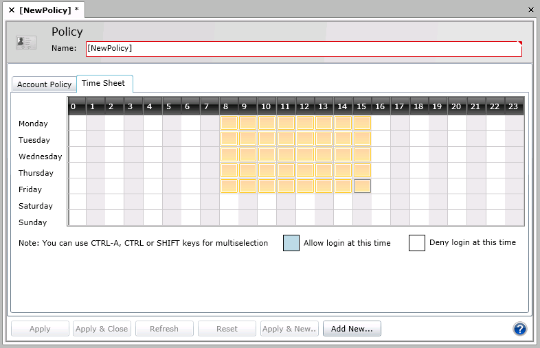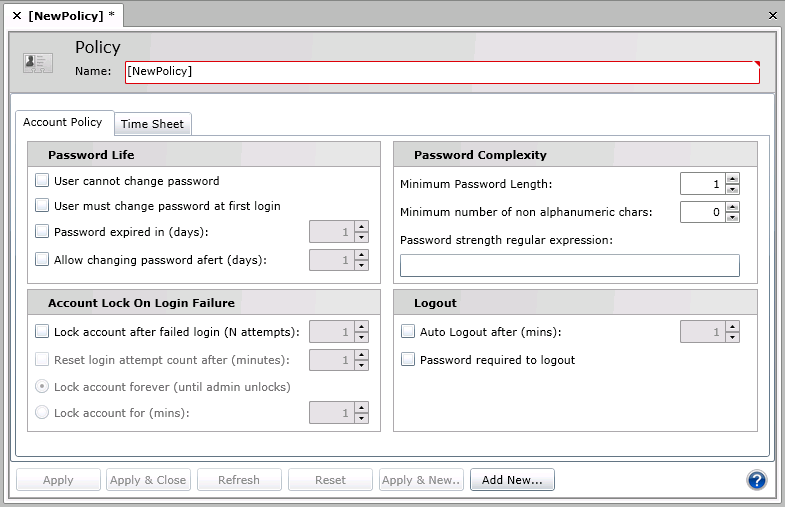2. Click Add Policy. This displays the Account Policy form, which has two tabs: an Account Policy tab and a Time Sheet tab.