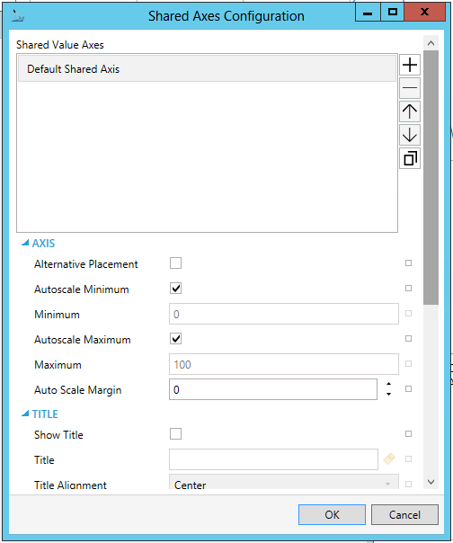 Within the Shared Value Axes section of the window, you can click on the plus sign [+] to add an item to the list. Each new item, in addition to the Default Shared Axis, will be shown as an additional axis (e.g. Axis1, Axis2, Axis3, etc.). Click on the minus sign [-] to remove a listed item. Click on the up arrow to move a selected item higher in the list. Click on the down arrow to move a selected item lower in the list. Click on the