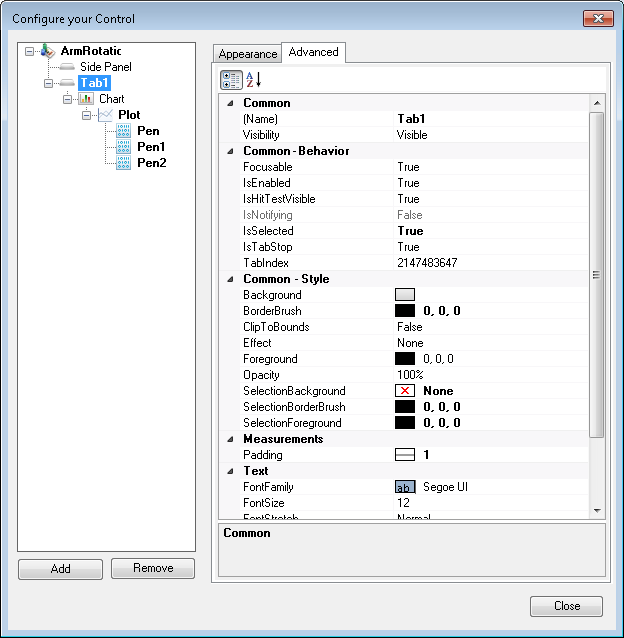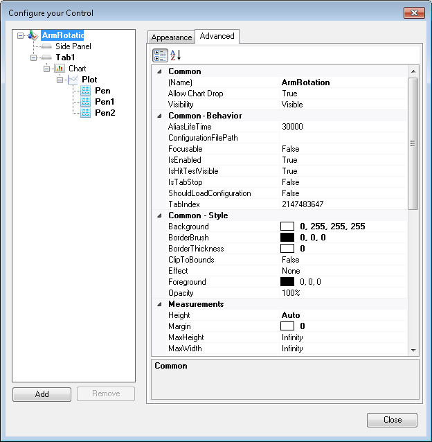 Every object in an TrendWorX64 Viewer display has a set of Advanced properties that control a number of the fine features you see on a TrendWorX64 Viewer display. These properties appear on the TrendWorX64 Viewer Configurator's Advanced tab. Some properties are shared by different objects (such as the viewer, tabs, and charts), while other properties apply to one type of object and not the others. At the bottom of the Advanced tab is a tool tip panel, which you can resize for better viewing; select a property on the tab to view a description of that property in the tool tip panel.